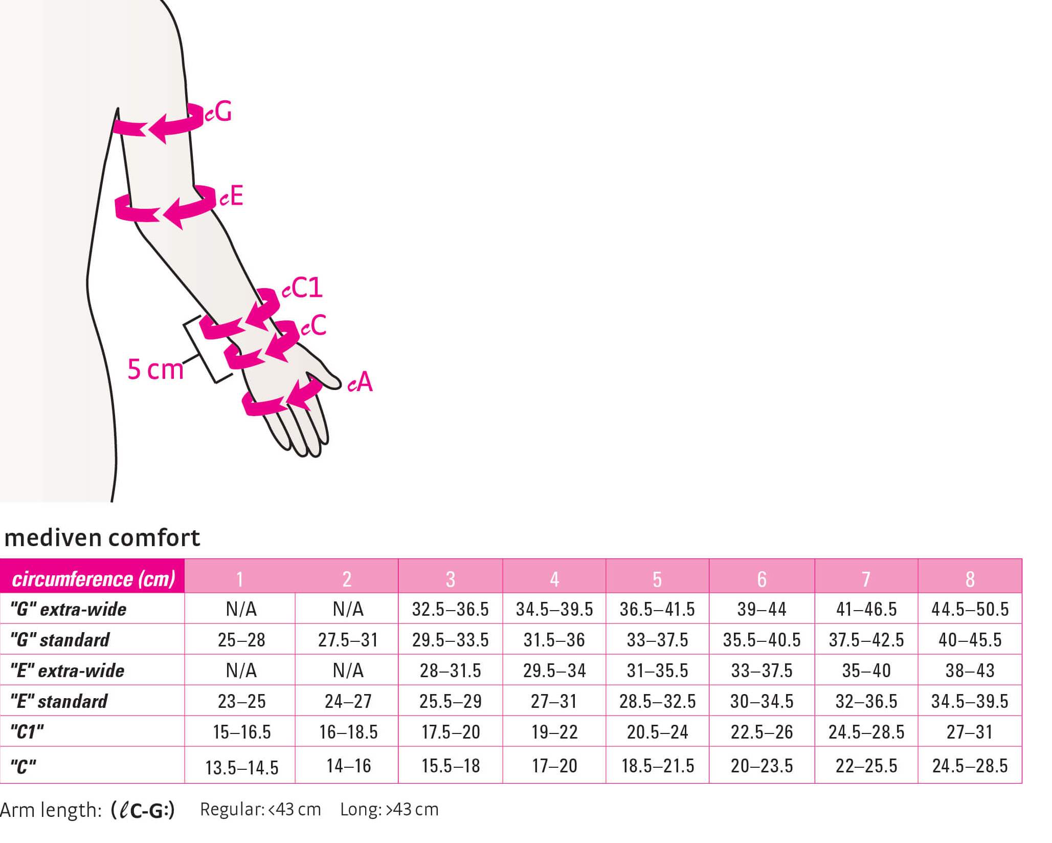 Click here to open the Mediven Comfort arm sleeve size chart.
