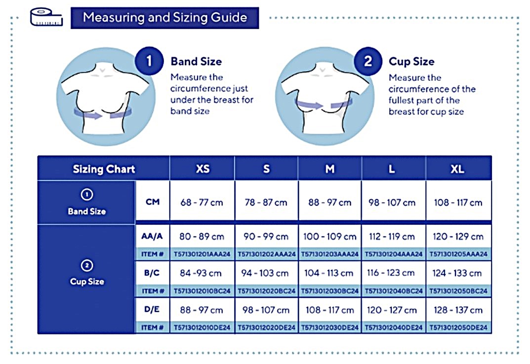 The Mobiderm Intimate compression bras are available in 5 different (band) sizes and 3 different cup sizes. To choose the correct size of the compression bra, you will need to measure the circumference just under your breast (band size) and the circumference of the fullest part of the breast (cup size) and then consult the Mobiderm Intimate compression bra sizing chart.