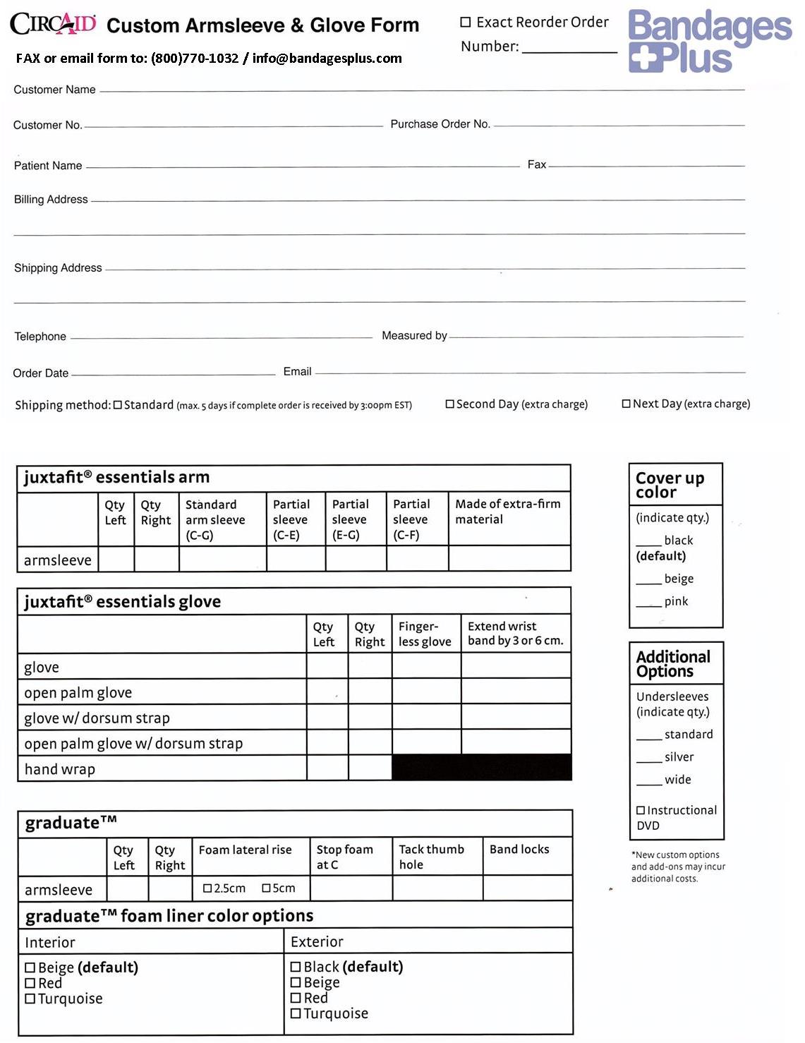This custom garment requires a completed order form to be submitted with an order. Click here to download the order form for the CircAid custom compression arm sleeve. Be sure to complete BOTH forms. Please contact us with questions or assistance in completing the form.