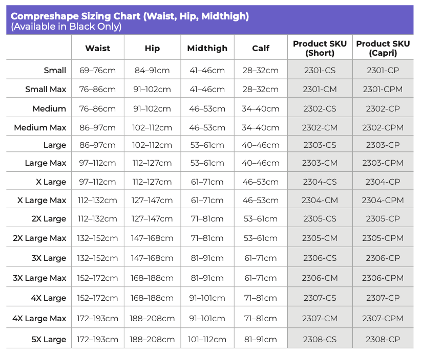 Click here to open the Compreshape Compression capri sizing chart.