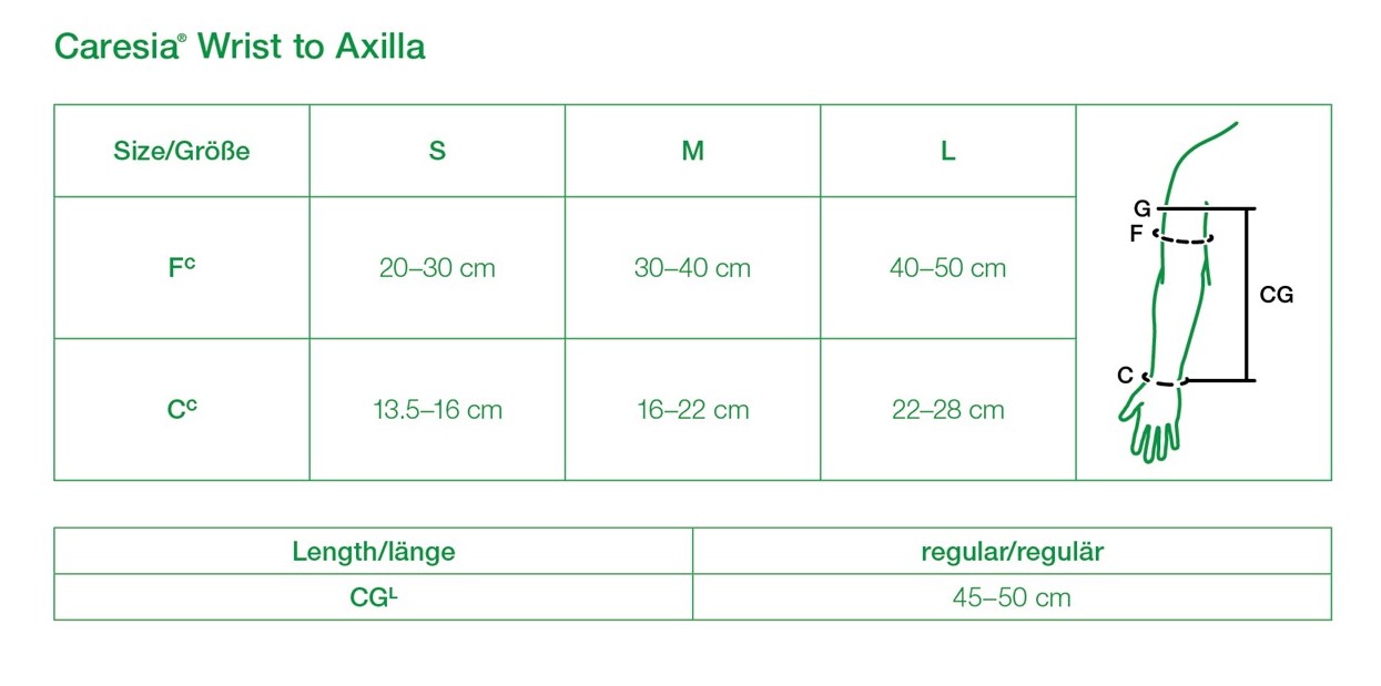 Click here to open the Solaris Caresia compression arm sleeve size chart.