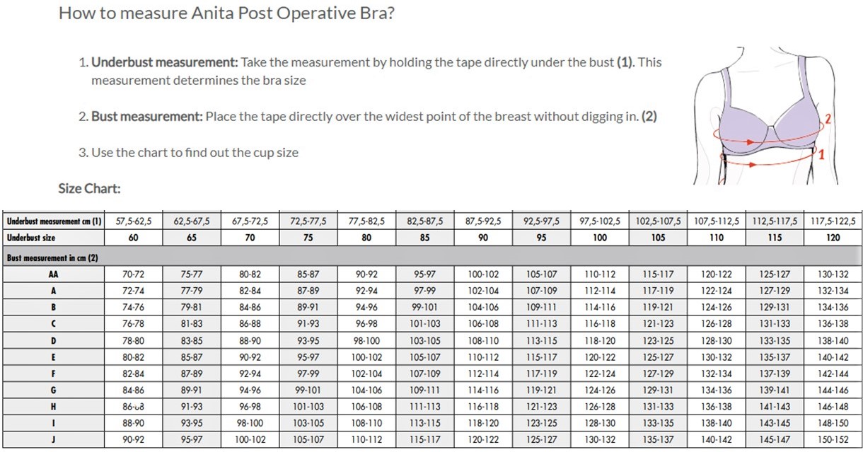 If you need assistance with sizing for Anita post-surgical and compression bras for lymphedema, you can call us Monday through Friday, from 9:00 am - 5:30 pm Eastern time, at (800) 770-1032, or email us any time at info@bandagesplus.com.