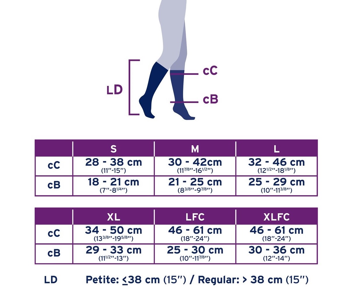 We have Jobst Opaque knee high compression stockings available in 4 different sizes, 2 lengths and 2 calf choices: