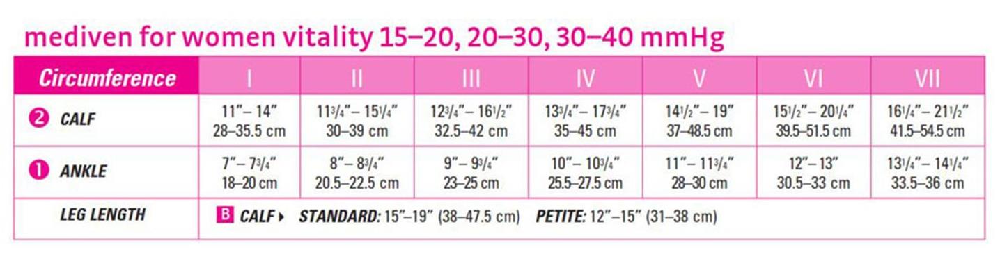 Click here to see the Mediven Comfort Vitality knee high compression stocking sizing chart.