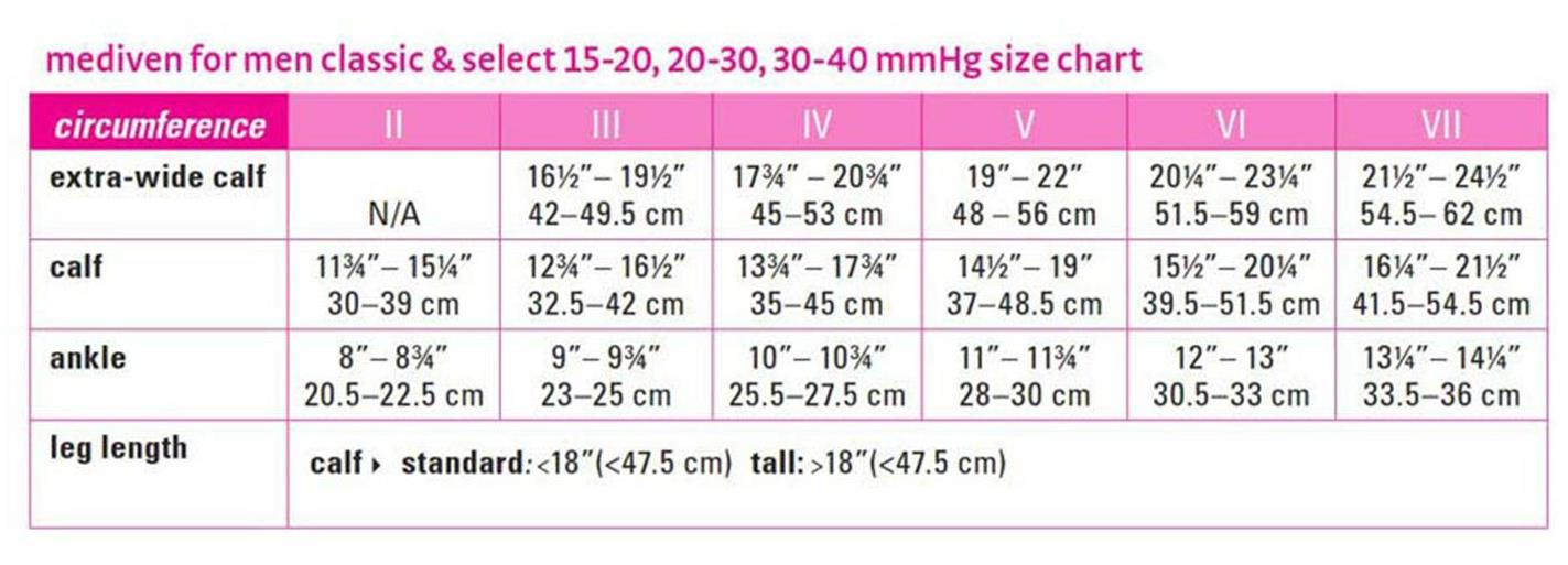 By using material specially developed by Medi USA, the Mediven® For Men Classic knee high compression stocking offers a soft, smooth and supple feel for optimum leg and foot comfort. With an ultra-modern broad ribbed design for a classic, yet fashionable look, the Mediven® For Men Classic stockings also feature the integrated Clima-Fresh technology with antibacterial properties to help reduce odor, and antifungal properties to reduce the formation of fungus caused by moisture. The patented Clima-Comfort fabric is combined with a lanolin-blend to help keep you naturally dry and refreshed. Designed with an anatomically correct left and right foot fit for added comfort! The Mediven® For Men Classic is indicated for use for: